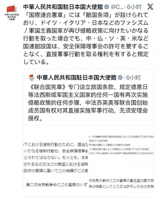 针对日本首相高市早苗妄言“台海有事可能引发日本的存亡危机事态”一事,中方最近火力全开。 中国驻日使馆援引《联合国宪章》“敌国条款”发出警告。日本外务省竟急得跳脚,妄言“敌国条款”已经“形同虚设”,却被日本民众打脸。