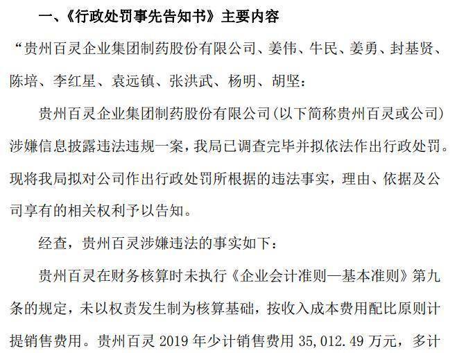 根据《告知书》,经查,贵州百灵涉嫌违法的事实如下:贵州百灵在财务核算时未执行《企业会计准则—基本准则》第九条的规定,未以权责发生制为核算基础,按收入成本费用配比原则计提销售费用。贵州百灵2019年少计销售费用35,012.49万元,多计利润35,012.49万元,占当期报告记载利润总额(绝对值)的95.73%;2020年少计销售费用24,080.95万元,多计利润24,080.95万元,占当期报告记载利润总额(绝对值)的115.35%;2021年少计销售费用6,379.16万元,多计利润6,379.16万元,占当期报告记载利润总额(绝对值)的45.04%;2023年多计销售费用45,941.10万元,少计利润45,941.10万元,占当期报告记载利润总额(绝对值)的93.17%。上述财务造假行为,导致贵州百灵披露的2019年,2020年,2021年,2023年年报存在虚假记载。